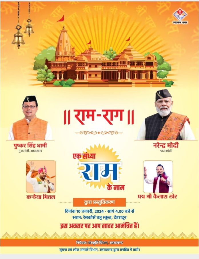 मुख्यमंत्री धामी बतौर मुख्यअतिथि होंगे शामिल, आज होगा भव्य सांस्कृतिक कार्यक्रम “राम-राग” का आयोजन,देहरादून के बन्नू स्कूल में आ जाओ सब..