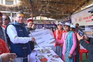 मुख्यमंत्री धामी ने प्रदर्शनी स्टॉलो का निरीक्षण करने के साथ ही विभिन्न योजनाओं के लाभार्थियों से संवाद किया और विभिन्न योजना के लाभार्थियों को चेक वितरित किए