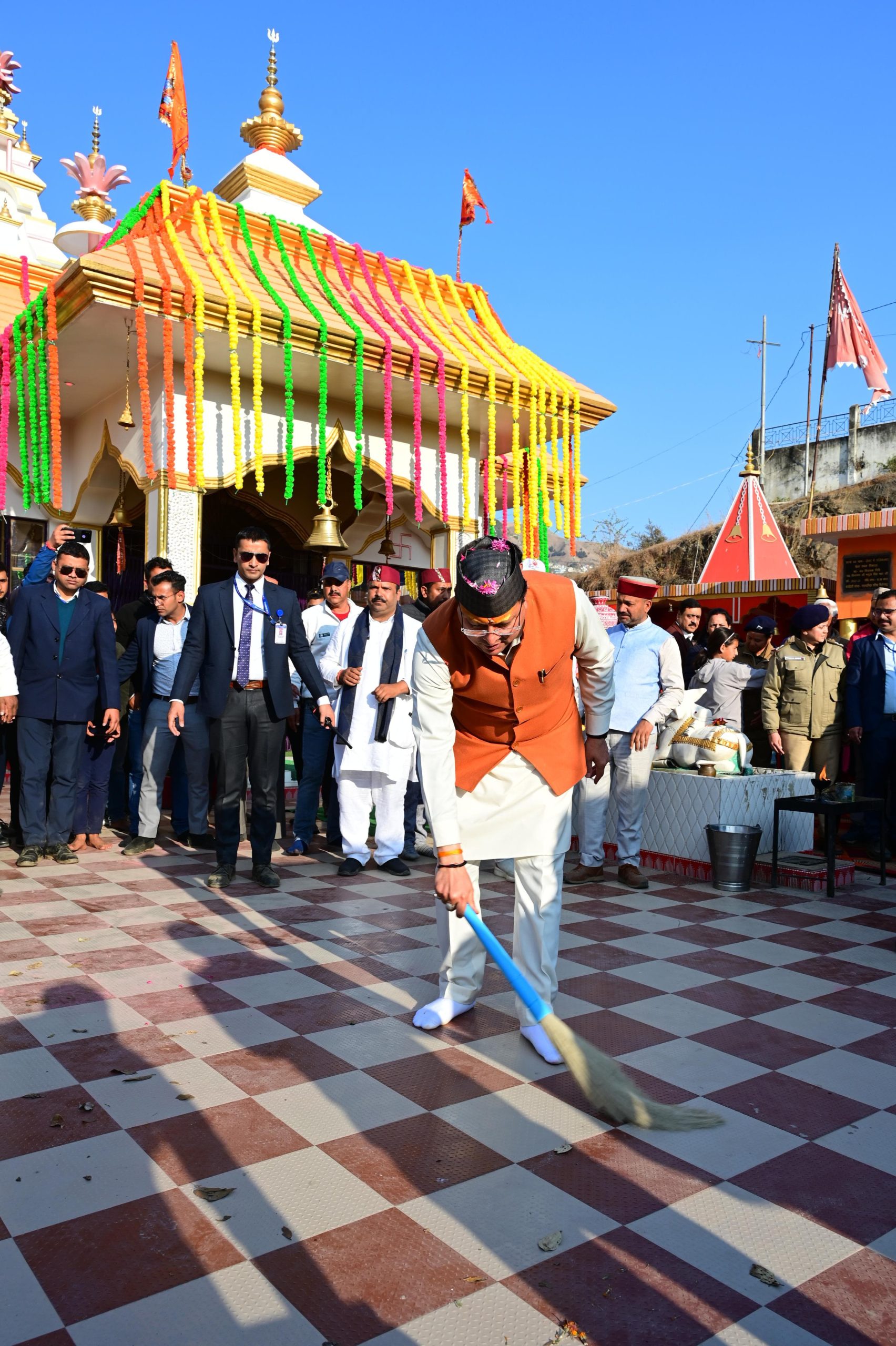 मुख्यमंत्री धामी ने मंदिर परिसर में स्वयं झाड़ू लगाकर धार्मिक स्थलों में स्वच्छता अभियान चलाए जाने का संदेश भी दिया..